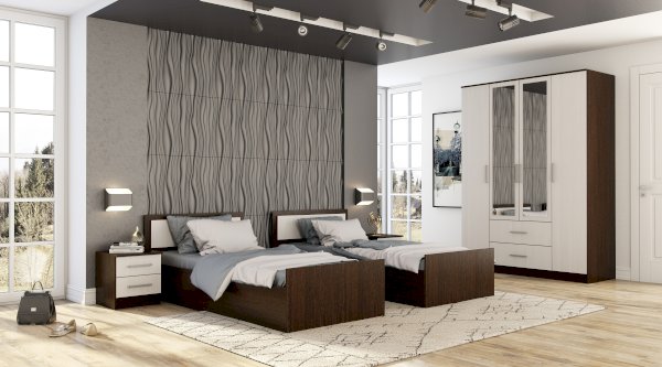 Вместительный четырёхстворчатый шкаф Фиеста справится с большим гардеробом и другими вещами. Модель выполнена из качественной ЛДСП. Корпус сделан в темном цвете венге, а фасады – в светлом лоредо. Комплектация представляет собой центральную зону с двумя нижними выкатными ящиками и отделения со штангой для одежды на плечиках. Справа и слева расположились многочисленные полки для вещей. В створки центральных дверок вмонтированы зеркала.