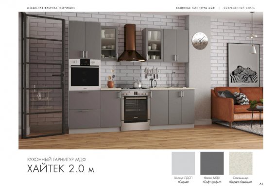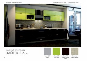 Специально для поклонников ультрасовременных интерьеров создан кухонный гарнитур «Хайтек». Мебель наделена всеми характеристиками этого стиля: стремительными линиями, монохромными цветами, глянцевыми поверхностями, минималисткой фурнитурой. Декоративные элементы не используются. Благодаря этим особенностям дизайна комплект не загромождает пространство.