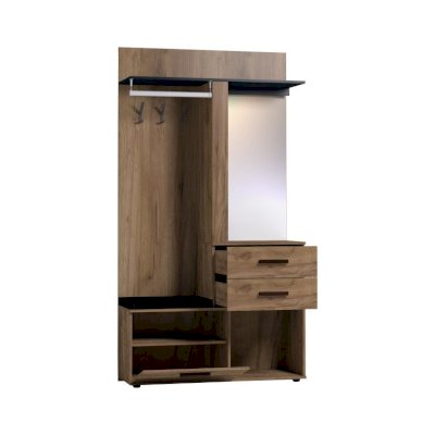 Комбинированный модуль Nature 70 Шкаф МЦН можно расположить в прихожей в составе шкафной группы или автономно. В небольшом по габаритам модуле сочетается всё необходимое: открытая вешалка, тумба для обуви, полка для головных уборов, выдвижные ящики, зеркало с подсветкой. Встроенная светодиодная подсветка включается при помощи аккуратного кнопочного выключателя. Выдвижные ящики оснащены шариковыми направляющими. Откидной фасад обувной тумбы дополнительно фиксируется при закрывании магнитной защелкой. В комплектацию входит мягкая подушка из черной экокожи с золотой строчкой. Собрать шкаф МЦН можно как на правую, так и на левую сторону.