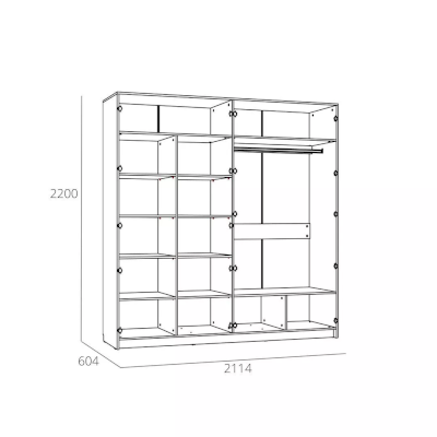 Четырехстворчатый шкаф LIVORNO НМ 013.58 станет достойной альтернативой гардеробной комнате, сэкономит пространство и задаст стиль интерьеру спальни. Внутри модуль разделен на две равные секции. В левой части шкафа находится секция из восьми полок для хранения одежды в сложенном виде. В правой половине модуля установлена штанга для одежды на вешалках плечиках. Зеркальные фасады добавят свет и визуально расширят комнату.