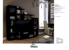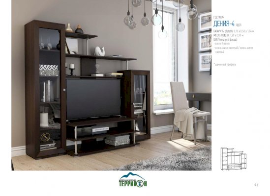 Небольшая по габаритам гостиная «Дения-4» станет гармоничным дополнением к любому интерьеру. Строгие формы и благородная расцветка в сочетании с элементами из стекла и металла смотрятся универсально. Гарнитур подходит к помещениям, оформленным в различной стилистике. Он отлично сочетается с классикой, минимализмом, техно, контемпорари и лофтом.