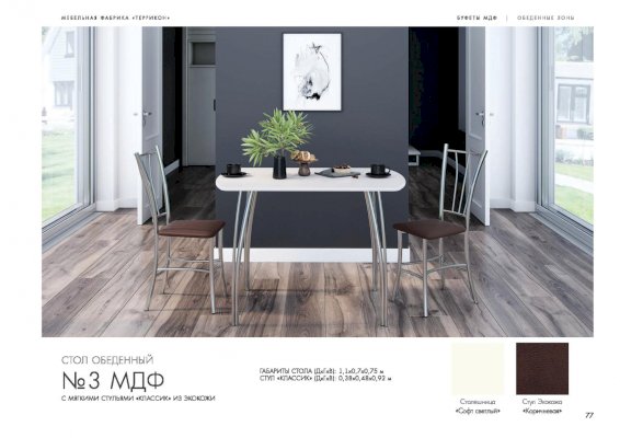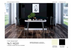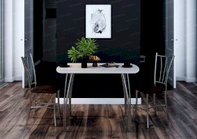 Светлая отделка и простые формы стола обеденного №3 отлично сочетаются с современными интерьерами. Модель гармонично вписывается в обеденные зоны в стилях хайтек и минимализм. Столешница со слегка закругленными углами изготовлена из качественной МДФ. Материал устойчив к влаге и высоким температурам. Изогнутые металлические ножки придают изделию легкость и изящество.