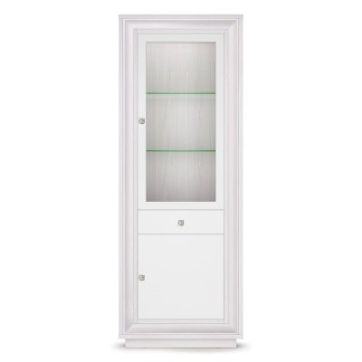 Яркий и нарядный образ витрины в стиле Ар-деко обеспечивает легкий ненавязчивый металлический блеск сатиновых фасадов и багета в цвете «жемчуг», который говорит о хорошем вкусе и статусе владельца мебели. Металлические ручки цвета «венецианское серебро» имеют растительный орнамент и завершают образ элегантной шкафа-витрины. Надежность изделия обеспечивает основательный корпус, выполненный из ЛДСП «ясень шимо светлый» толщиной 25 и 16 мм.